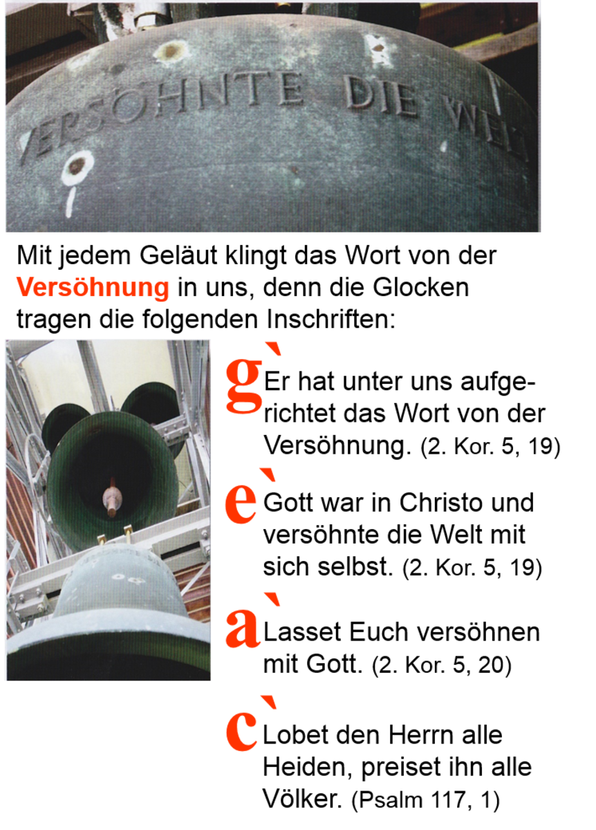 Wir hören nun die Glocke mit dem Ton „G“, die die Inschrift trägt: „Er(Gott)hat unter uns aufgerichtet das Wort von der Versöhnung.“